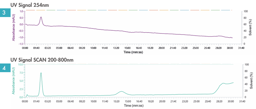圖3與圖4:紫外檢測(cè)下化合物不可見。檢測(cè)初期首波化合物開始顯現(xiàn)低強(qiáng)度信號(hào),但強(qiáng)度不足以實(shí)現(xiàn)有效收集