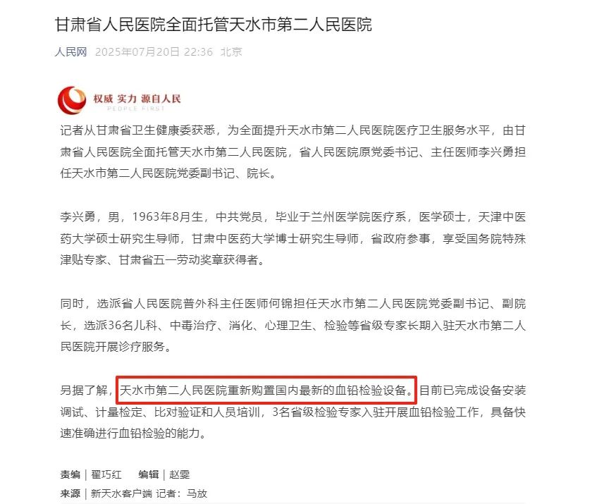該設(shè)備為國家二類醫(yī)療器械,按照省委省政府調(diào)查組主導下通過甘肅省計量研究院權(quán)威檢定,并嚴格按照省級專家組制定的應(yīng)急檢測標準流程完成安裝調(diào)試與比對驗證,由三名省級檢驗專家進駐使用,天水市第二人民醫(yī)院血鉛檢測能力的準確性、快速性和合規(guī)性將得到大幅提升。